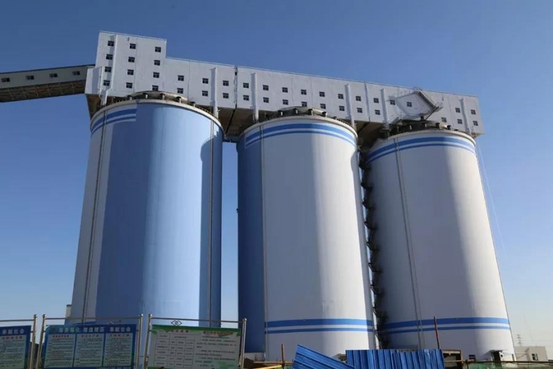 距離汽車臨時快速裝車站百米開外的地方,矗立著三座巨大的圓形筒倉。這是礦井儲存原煤的場所,每個倉都可以存放3萬多噸原煤。抬頭望去,工人們乘坐著吊籃,系著安全帶,正在為原煤倉涂抹最后一層涂料,使淺藍(lán)色筒倉在礦區(qū)顯的格外耀眼。