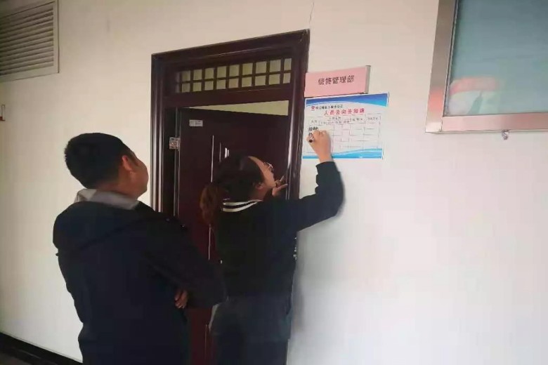 “小王出差了,咱明天再來?!敝芩脑绯?,一位項目部的工作人員來到小保當公司機關辦事,看到辦公室門前的工作人員“去向告知牌”,得知工作人員外出,就對照“去向牌”上公示的電話號碼撥打小王的手機號碼,約定了來辦事的具體時間后,滿意而歸。