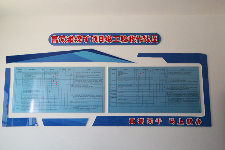 走進(jìn)曹家灘項(xiàng)目驗(yàn)收竣工辦公室,一幅紅藍(lán)搭配的《曹家灘煤礦項(xiàng)目竣工驗(yàn)收作戰(zhàn)圖》便映入眼簾。走近一看,在作戰(zhàn)圖上詳細(xì)分布著十項(xiàng)內(nèi)容:職業(yè)病防護(hù)設(shè)施、安全設(shè)施驗(yàn)收、水保驗(yàn)收、環(huán)保驗(yàn)收、檔案驗(yàn)收、消防驗(yàn)收、工程質(zhì)量認(rèn)證、竣工結(jié)算、聯(lián)合試運(yùn)轉(zhuǎn)驗(yàn)收、竣工整體竣工驗(yàn)收。每項(xiàng)單項(xiàng)內(nèi)容由單項(xiàng)驗(yàn)收內(nèi)容、單項(xiàng)驗(yàn)收重點(diǎn)內(nèi)容、時(shí)間節(jié)點(diǎn)、完成進(jìn)度百分比、單項(xiàng)驗(yàn)收完成時(shí)間、完成情況、責(zé)任領(lǐng)導(dǎo)、責(zé)任人、工作人員、工作安排組成,通過(guò)采取橫豎交錯(cuò),數(shù)字相結(jié)合的形式,直觀地展示了公司項(xiàng)目竣工驗(yàn)收各項(xiàng)工作進(jìn)展情況。