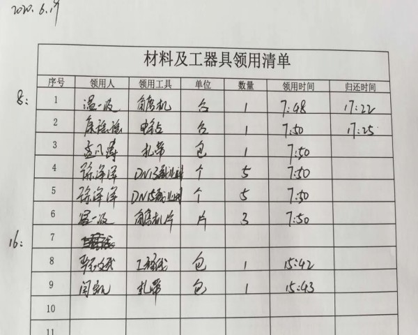 同時,該隊還積極回收井下能夠再利用的材料,通過材料員日常修復,使材料實現(xiàn)二次利用。要求各施工班長積極配合材料員對回收材料進行修復,通過加強材料管理,形成清晰的材料及工器具領(lǐng)用清單和歸還清單,全面降低材料消耗成本。